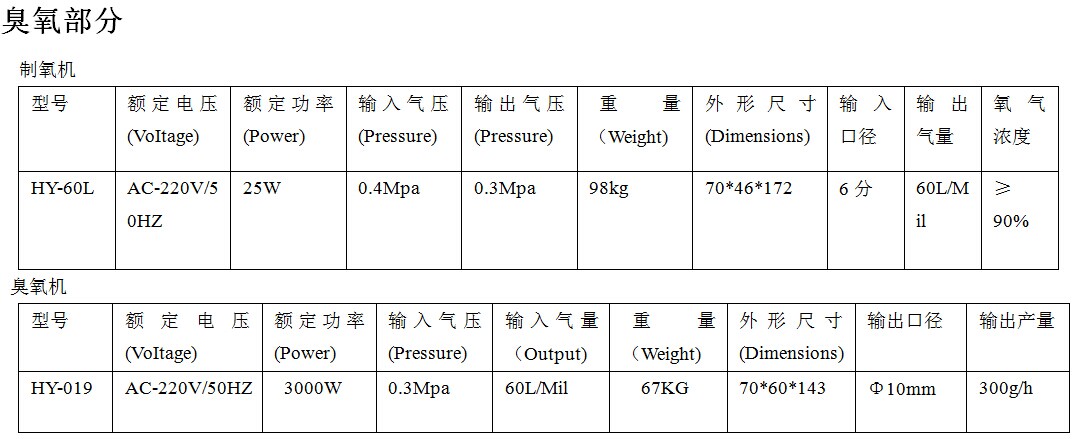 臭氧發(fā)生器選型: 1.按高壓電頻率劃分,有工頻(50-60Hz)、中頻(400-1000Hz)和高頻(>1000Hz)三種。工頻發(fā)生器由于體積大、功耗高等缺點(diǎn),目前已基本退出市場(chǎng)。中、高頻具有體積小、功耗低、臭氧產(chǎn)量大等優(yōu)點(diǎn),是現(xiàn)在最常用的產(chǎn)品。 2.按使用的氣體原料劃分,有氧氣型和空氣型兩種。氧氣型通常是由氧氣瓶或制氧機(jī)供應(yīng)氧氣。空氣型通常是使用空氣(如壓縮空氣)作為原料。由于臭氧是靠氧氣來(lái)產(chǎn)生的,而空氣中氧氣的含量只有21%,所以空氣型發(fā)生器產(chǎn)生的臭氧濃度比氧氣型稍低。而瓶裝或制氧機(jī)的氧氣純度都在90%以上,所以氧氣型發(fā)生器的臭氧濃度較高。在環(huán)境消毒時(shí),通常使用空氣型發(fā)生器。在水處理時(shí),應(yīng)優(yōu)先考慮氧氣型發(fā)生器。但如果消毒飲用水時(shí),發(fā)生器需要配合舊式臭氧混合塔使用,則只能選用空氣型。 3.按冷卻方式劃分,有水冷型臭氧發(fā)生器和風(fēng)冷型臭氧發(fā)生器。工作時(shí)會(huì)產(chǎn)生大量的熱能,需要冷卻,否則臭氧會(huì)因高溫而邊產(chǎn)生邊分解。水冷型發(fā)生器冷卻效果好,工作穩(wěn)定,臭氧無(wú)衰減,并能長(zhǎng)時(shí)間連續(xù)工作,但結(jié)構(gòu)復(fù)雜,成本高。風(fēng)冷型冷卻效果不夠理想,臭氧衰減明顯。大型臭氧發(fā)生器或重要場(chǎng)所使用的發(fā)生器通常都是水冷式的。風(fēng)冷一般只用于臭氧產(chǎn)量較小的發(fā)生器或?qū)Πl(fā)生器性能要求不嚴(yán)格的場(chǎng)所。在選用時(shí),應(yīng)盡量選用水冷型的。 4、按介電材料劃分,常見(jiàn)的有石英管臭氧發(fā)生器、陶瓷板臭氧發(fā)生器、陶瓷管臭氧發(fā)生器、玻璃管臭氧發(fā)生器和搪瓷管臭氧發(fā)生器等幾種類(lèi)型。其中石英管由于具有介電常數(shù)高、壁厚均勻、橢圓度好、耐高溫、耐潮濕等特點(diǎn)而最常被一些高性能的臭氧發(fā)生器使用。陶瓷板易脆裂,只適用一些小型發(fā)生器。陶瓷管的壁厚和橢圓度不易控制,容易出現(xiàn)放電不均勻的問(wèn)題,所以使用的不多。玻璃管和搪瓷管介電常數(shù)低,耐高溫性能差,易炸裂,只有在一些低端發(fā)生器上使用. 5、按臭氧產(chǎn)生部件的結(jié)構(gòu)劃分,有密閉式和開(kāi)放式兩種。密閉式發(fā)生器的結(jié)構(gòu)特點(diǎn)是密封體本身就是電極,臭氧能夠集中使用,如用于水處理。開(kāi)放式發(fā)生器的電極是裸露在空氣中的,所產(chǎn)生的臭氧無(wú)法集中使用,通常只用于較小空間的空氣凈化或某些小型物品表面消毒。密閉式發(fā)生器可代替開(kāi)放式發(fā)生器使用。密閉式發(fā)生器的成本遠(yuǎn)高于開(kāi)放式發(fā)生器。值得注意的是,現(xiàn)在有些人把開(kāi)放式發(fā)生器硬性封裝起來(lái),冒充密閉式發(fā)生器。這樣做的結(jié)果是由于大量的熱量無(wú)法及時(shí)散發(fā),臭氧衰減嚴(yán)重,發(fā)生器也很快燒損。 廣州佳環(huán)臭氧發(fā)生器保養(yǎng): 1、請(qǐng)將本設(shè)備置于干燥通風(fēng)處,防塵網(wǎng)(風(fēng)扇處)一個(gè)月清理一次; 2、本設(shè)備非專(zhuān)業(yè)電工,請(qǐng)勿開(kāi)箱(內(nèi)有高壓); 3、保養(yǎng)時(shí)請(qǐng)專(zhuān)業(yè)電工,開(kāi)啟機(jī)箱后蓋; 4、硅膠管三個(gè)月更換一次,效果更佳; 5、檢查機(jī)器內(nèi)部接頭是否松動(dòng)和軟管老化; 6、如有接頭松動(dòng),請(qǐng)用螺絲刀扭緊,軟管老化,請(qǐng)及時(shí)更換; 7、所有購(gòu)買(mǎi)本公司產(chǎn)品的客戶(hù),均可在本公司以低于市場(chǎng)價(jià)購(gòu)買(mǎi)配件; 8、設(shè)備維修保養(yǎng)(如需上門(mén)維修,需由客戶(hù)支付差旅費(fèi)用,公司視路途遠(yuǎn)近,選擇就近經(jīng)銷(xiāo)商上門(mén)維修;) 9、設(shè)備維修時(shí),請(qǐng)將保修卡隨機(jī)一起寄回本公司。 廣州佳環(huán)臭氧發(fā)生器基本故障檢測(cè): (一)、機(jī)器不通電:電源插頭是否插好,插座是否有220V 交流電; (二)、臭氧輸出口氣量輸出: 1、如氧氣輸入口有氣量輸入,機(jī)器內(nèi)部線路接頭是否漏氣、脫落、管路是否打折; (三)、無(wú)臭氧(有氣) 1、臭氧指示燈不亮,開(kāi)關(guān)是否打開(kāi); 2.如果開(kāi)關(guān)已打開(kāi),還是沒(méi)有臭氧,模塊損壞; (四)、臭氧消毒注意事項(xiàng): 1:機(jī)器設(shè)備必須放置在無(wú)油污、空氣干凈、干燥的地方工作,以延長(zhǎng)機(jī)器設(shè)備使用壽命。 2:使用時(shí)必須輕拿輕放,不能亂扔亂放。 3:機(jī)器設(shè)備用于水處理,臭氧輸出口必須接上止回閥。,(注意:止回閥分正反,在沒(méi)接止回閥前檢查有臭氧輸出,再接上止回閥,如沒(méi)臭氧就證明止回閥接方向接反,在這時(shí)倒一頭就可以了);防止回水進(jìn)入機(jī)內(nèi),損壞機(jī)器。 4:禁止將臭氧機(jī)放在消毒區(qū)內(nèi)工作,為了工作的安全,設(shè)備應(yīng)有單獨(dú)工作區(qū),再用硅膠管將臭氧氣體輸送到消毒或化學(xué)反應(yīng)區(qū)。 5:機(jī)器設(shè)備必須天天檢查維護(hù);如發(fā)現(xiàn)異常要立刻關(guān)機(jī),查明原因、處理好后再用。 6:使用前機(jī)器設(shè)備必須良好接地,以防雷電。不用時(shí)最好拔掉電源插頭。 7:根據(jù)工作環(huán)境、使用要求,正確選用臭氧