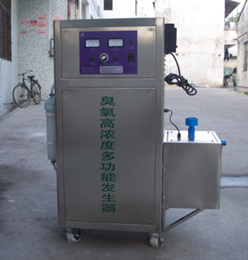 1. 直接吹送法:適用于容積較小的車(chē)間 1.1將機(jī)器安裝在消毒間外通風(fēng)干燥的地方。 1.2連接臭氧硅膠輸送管,管道出氣口應(yīng)置于車(chē)間內(nèi)2/3以上的高度,以便于臭氧彌漫于整個(gè)消毒間。20克以下為風(fēng)冷臭氧發(fā)生器,通電直接使用;20克以上為風(fēng)冷+水冷臭氧發(fā)生器,需要外接冷卻水。 外接冷卻水的方法有兩種:直接連接自來(lái)水或用水箱+循環(huán)泵做一個(gè)循環(huán)利用的 水系統(tǒng)。下圖為外接冷卻水箱的40克臭氧發(fā)生器: