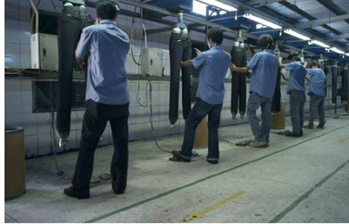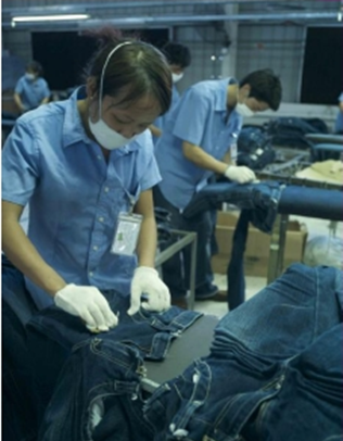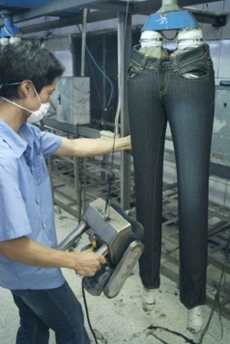 三:臭氧氧化與傳統(tǒng)方法的優(yōu)缺點比較 1. 用次氯酸鈉(婆梅度為18度)經(jīng)濟;不好控制,有傷布的纖維。健康危害:經(jīng)常用手接觸本品的工人,手掌大量出汗,指甲變薄,毛發(fā)脫落。本品有致敏作用。本品放出的氯氣有可能引起中毒。具腐蝕性,可致人體灼傷,具致敏性。 2. 用亞氯酸鈉和硫酸在加次氯酸鈉。價格比上一種高點。但比上一種好點。不傷布的纖維。亞氯酸鈉有強氧化性。在175℃時即分解而發(fā)熱,與可燃物質(zhì)接觸,即起猛烈爆炸,須注意安全。硫酸對環(huán)境有危害,對水體和土壤可造成酸性污染。具強腐蝕性、強刺激性,可致人體灼傷。 3. 高錳酸鉀、過醋酸和還原漂白方式 關(guān)于牛仔布漂白,除了用次氯酸鈉和亞氯酸鈉外,還可以用高錳酸鉀、過醋酸和還原漂白方式,具體需要根據(jù)牛仔布所用染料類型來選擇,傳統(tǒng)牛仔為還原淀籃染料,也有用硫化染料或直接染料代替,也有采用活性染料代替的,故此,需要根據(jù)具體情況考慮。 4. 臭氧氧化的優(yōu)點 a) 無污染,臭氧為純凈物。在常溫下,易分解,生成氧氣和氧原子 b) 臭氧的氧化能力極強。 c) 運行成本低 四:手工處理 1.手擦 a) 在洗水前,通過使用砂輪滾動摩擦而使布面染料褪色,手擦的地方通常是脾位和臀位,人為的機械褪色,讓牛褲在洗水后顯得自然地懷舊和泛白 b) 噴沙和手擦效果接近,但對布紋的效果有差別。噴沙后布紋模糊,沉底,而手擦后布紋清晰凸顯