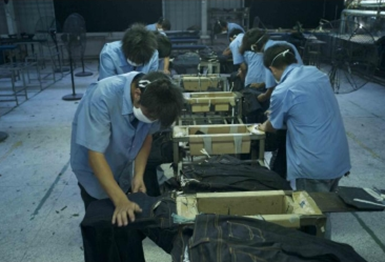 3.磨邊 磨爛 勾紗 將衣物在洗水前,人為地將褲腳,褲頭等一些特定部位用銳器刮爛,從而制成洗后的破爛懷舊效果 4.打搶.手針 用線將牛褲某些部位縫起,凸出的部位由于在洗水過程中受的的摩擦較多,從而掉色較嚴重,水洗效果也較明顯,而凹入的部位在洗水過程中受的的摩擦較少,從而掉色較輕,水洗效果不明顯。同沒做手針的其它部位形成深中淺的三種洗水效果 5.立體貓須 將衣物浸免燙樹脂并脫水后,在特定部位用夾子夾出需要的形狀,起伏度,然后再高溫烘焙,讓樹脂交聯(lián)定型,從而制出永久的立體褶皺效果 6.噴砂 是在洗水前,通過使用一些表面粗糙的物質(zhì)(如硼砂),通過噴槍在一定的氣壓作用下使沙打擊并摩擦布面而達到褪色的效果,噴砂的地方經(jīng)洗水后顯得較為自然地懷舊和泛白,給人較強隨意感 7.扎花 扎洗是在洗水的過程中將衣物以繩子等東西全部或局部扎起來后洗水,以達到洗后布面呈現(xiàn)隨意的深淺色對比,有浮云般的效果(類似扎染 8.馬騮 噴一些氧化劑,一般是高錳酸鉀溶液,讓衣物局部褪色,從而讓牛褲顯得自然地懷舊和泛白 9.噴色 抹色 將衣物在洗水后,用人手將涂料或者直接料涂抹或者噴灑在衣物表面,制作懷舊效果
